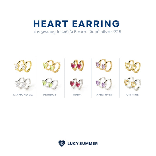 LUCY SUMMER Heart Earrings ต่างหูหัวใจพลอยแท้ รูปทรงหัวใจ ตัวเรือนทำจากเงินแท้ Silver 925 ชุป Gold 18