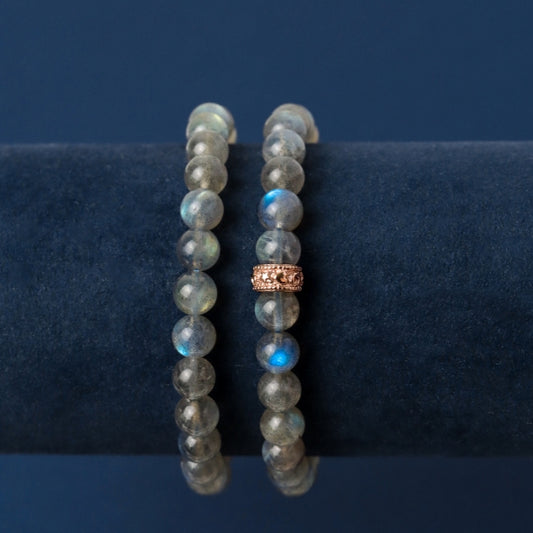 LUCY SUMMER กำไลข้อมือหิน Labradolite ขนาด 6 mm สีเทาควัญบุหรี่เหลือบแสงสีฟ้าเขียวน้ำเงิน