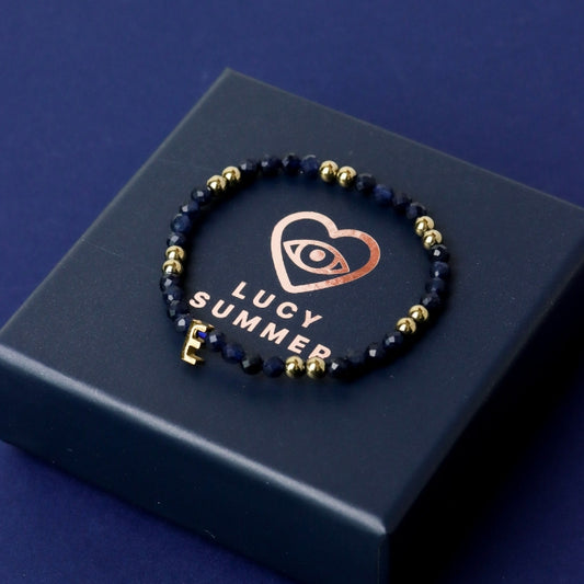 LUCY SUMMER กำไลข้อมือหินแท้ ไพลิน Blue Sapphire คั่นด้วย Pyrite พร้อมจี้ตัวอักษร A-Z สีทอง