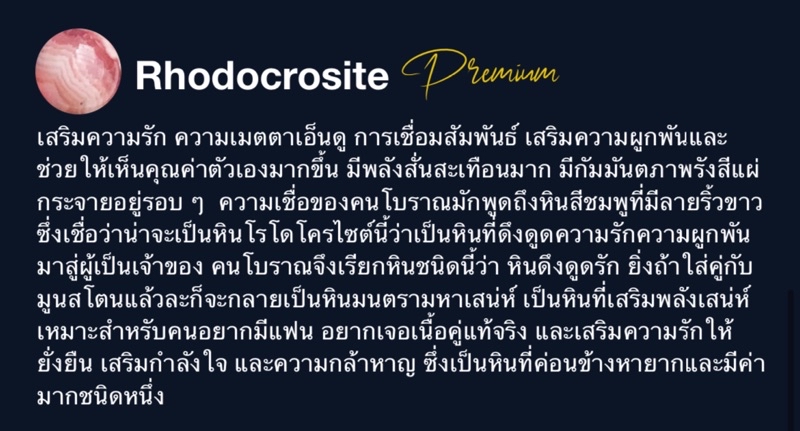 เสริมความรัก ความเมตตาเอ็นดู การเชื่อมสัมพันธ์ เสริมความผูกพันและช่วยให้เห็นคุณค่าตัวเองมากขึ้นหินชนิดนี้มีสีชมพูลายริ้วขาว หรือมีสีแดงอ่อนเรื่อปนขาว มีลักษณะทึบแสง บางชนิดมีสีชมพูอมทอง ซึ่งถือว่ามีพลังสั่นสะเทือนมาก มีกัมมันตภาพรังสีแผ่กระจายอยู่รอบ ๆ ผู้สวมใส่มีทั้งเป็นก้อนและเป็นผลึก ความเชื่อของคนโบราณมักพูดถึงหินสีโทนแดงอ่อนปนขาว หรือหินสีชมพูที่มีลายริ้วขาว ซึ่งเชื่อว่าน่าจะเป็นหินโรโดโครไซต์นี้ว่าเป็นหินที่ดึงดูดความรักความผูกพันมาสู่ผู้เป็นเจ้าของ คนโบราณจึงเรียกหินชนิดนี้ว่า หินดึงดูดรัก