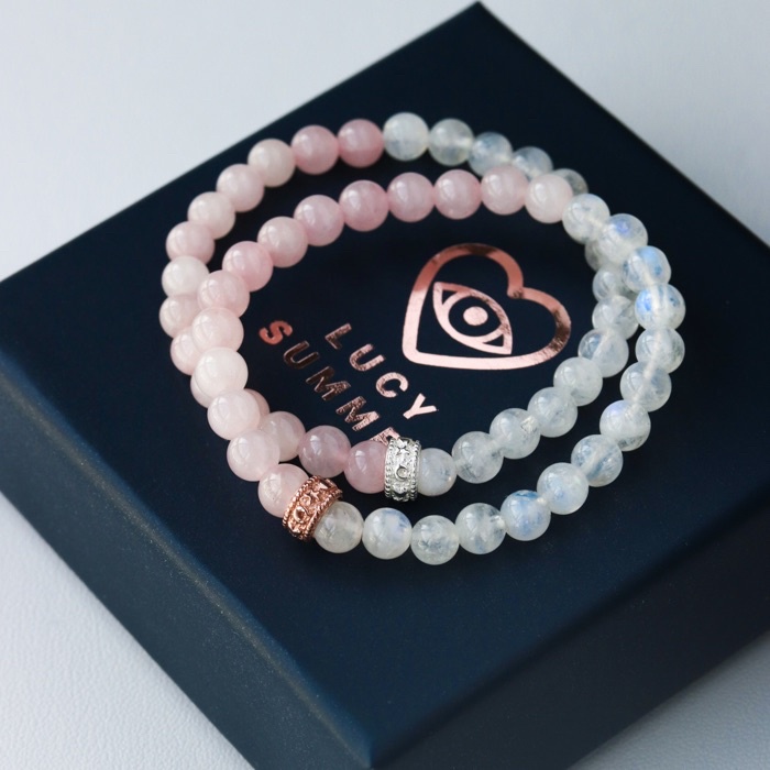 LUCY SUMMER RoseMoon กำไลข้อมือหินแท้ Rose Quartz และ Moonstone ขนาด 6 mm แต่งด้วยจี้ตัวคั่น Spacer เ